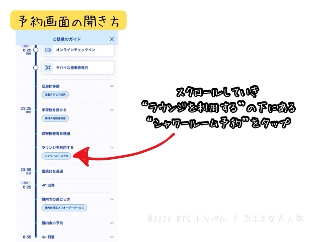 下の画像の様な時系列になった当日の流れが表示されますので、”ラウンジを利用する”の箇所までスクロールし、その下の”シャワールーム予約”をタップ。
