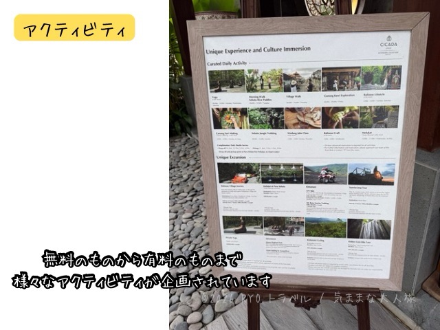 曜日ごとにさまざまなアクティビティが企画されており、無料のものから有料のものまでありました。ラインナップについては客室のTV内のホテル情報のところ、またはフロント前に掲示してあります。