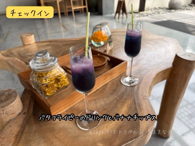 先にパスポートを預け、バタフライピーのウェルカムドリンクとバナナチップスをいただきながら、チェックインの手続きを待ちます。