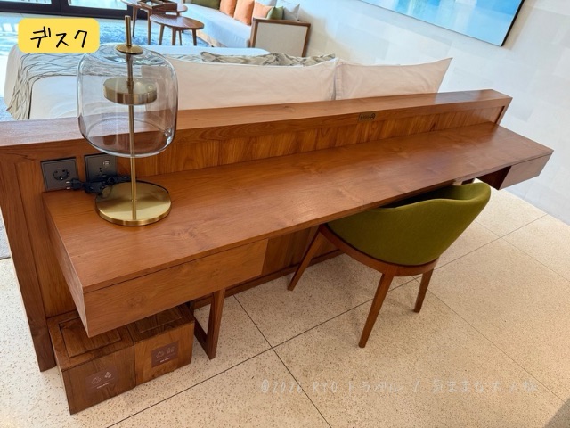 ベットのヘッドボードの部分がデスクになっているため、デスクの奥行きは狭めで、横幅が広い作り。
