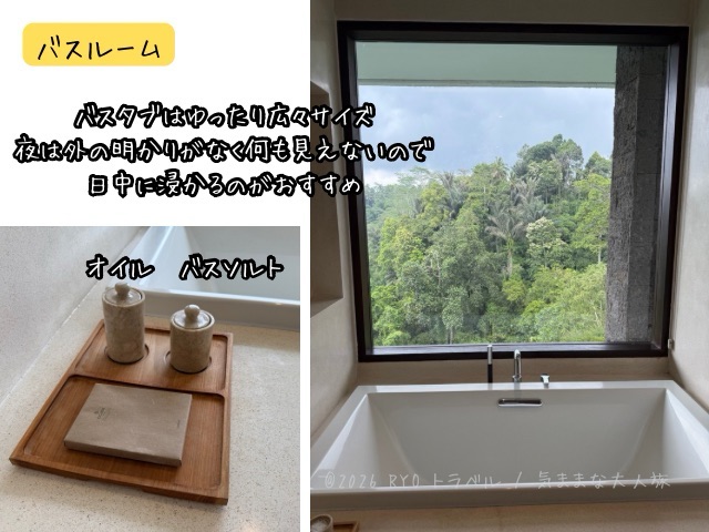 バスタブ横が窓になっていて、ジャングルを眺めながら湯に浸かることができます。ただ、夜間は真っ暗になって何も見えないので、日中にに浸かることをお勧めします。