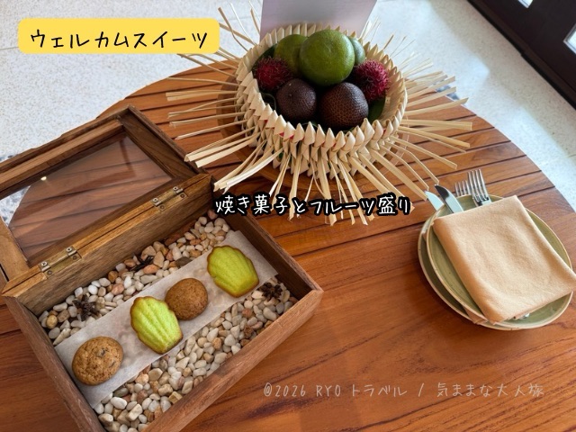 ○ ウェルカムギフト フルーツの盛り合わせと焼き菓子が客室に置いてありました。初日にウェルカムフルーツを食べつくしたところ、翌日の清掃時に補充されていました。(一度きりじゃない模様)