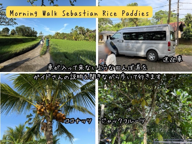 水田に関する話だけでなく、傍に自生しているバナナ、ジャックフルーツ、ココナッツ等の説明もあり、気持ちのいい朝の散歩ができました