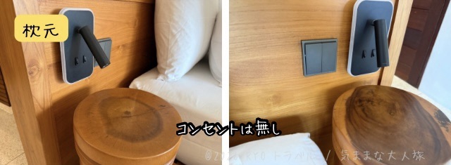 ベットサイドに読書灯とサイドテーブルがありますが、コンセントは無し。
