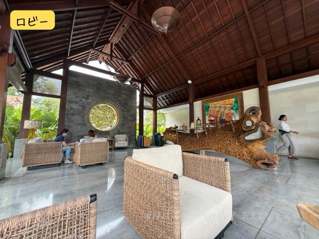 ロビー入り口にてバリの伝統的(?)な儀式により、水を頭頂部に振りかけ、水を浸したお米を眉間に付け、ホテルロゴのチャームがついたお守りのブレスレットを付けてもらってから着席。