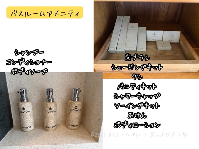 アメニティは石けん、ボディローション、歯ブラシ、シェーバー、シャワーキャップ、バニティキット、ソーイングキットがありました。