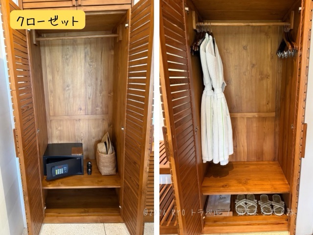 クローゼットは2カ所あり、片方にはホテル内で使用できる籠バッグと帽子、金庫。もう一方には、ハンガー、バスローブ、スリッパ、ランドリーバッグがありました。
