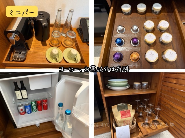 ミニバーはエスプレッソとお茶が無料で、冷蔵庫内のドリンクとチップスは有料となっていました。