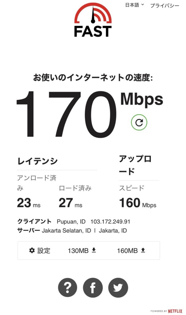 無料Wi-Fiはワンクリックで接続。パスワード無し。速度は170Mbpsと十分な速度で、インターネットでの調べ物や動画視聴程度の利用も問題なくできました。