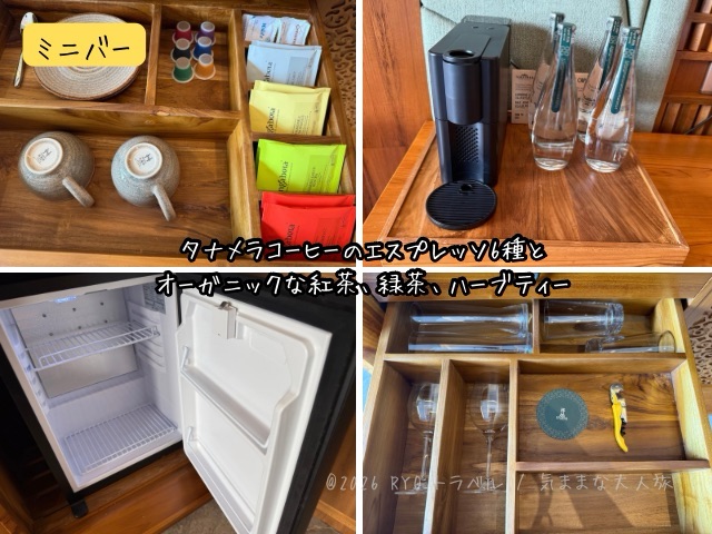 ミニバーにはインドネシアのコーヒーロースターのTANAMERAのエスプレッソ6種、お茶もインドネシアのジャワ島産の高品質な素材を使用したSingaberaというメーカーの紅茶、緑茶、ハーブティーのティーバッグが用意されていました。冷蔵庫の中は空でした。