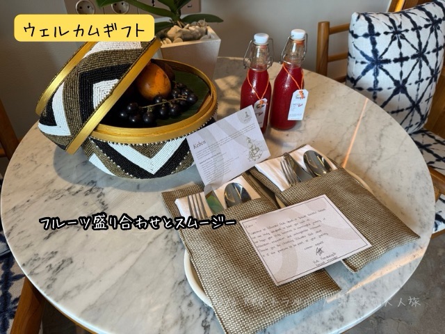 ○ ウェルカムギフト フルーツの盛り合わせとスムージーが客室に届けられました。