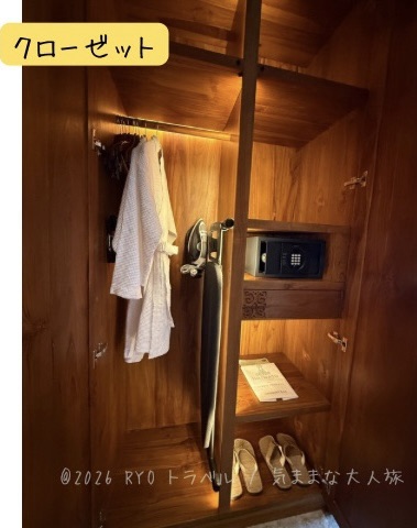 クローゼットはハンガー、バスローブ、アイロン、アイロン台、スリッパ、金庫、ランドリーボックスがありました。スリッパはイ草?的な素材のもので、使い捨てするにはもったいないくらいしっかりとした造りのモノでした。
