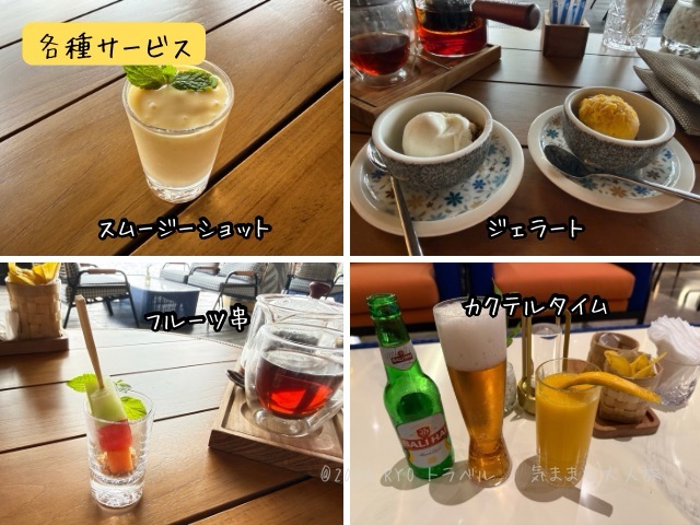 カクテル、ビール、ワイン、スムージー、ジュース等の中から1人1杯注文できます。(イブニングカクテル用の専用メニュー表の中から選択)