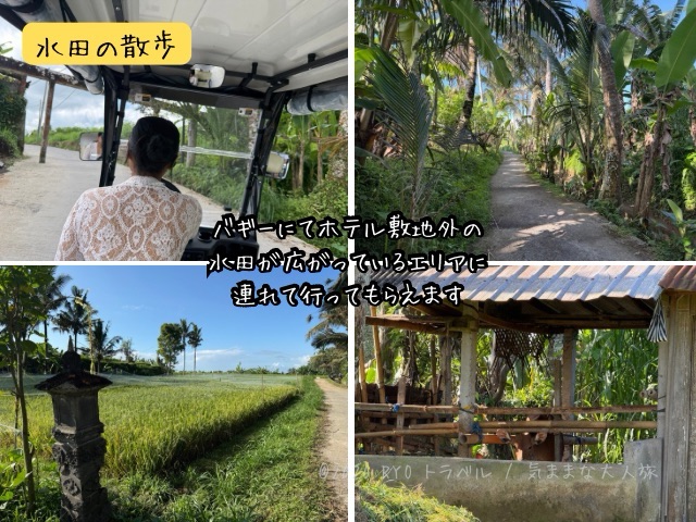 フロントに依頼するとバギーを手配してくださり、ホテル敷地外の水田が綺麗な散歩コースに案内してくれます。事前に時間を約束して降りた場所に迎えに来てもらうか、Whats Appにて依頼すれば良いとのこと。(私は1時間後にと依頼しました)