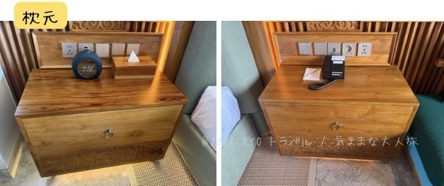 枕元には両サイドにコンセント有り。マルチタイプのコンセントになっているので、変換プラグ無しで使えるのが嬉しいポイント。置き時計とティッシュ、メモ、電話が置かれていました。