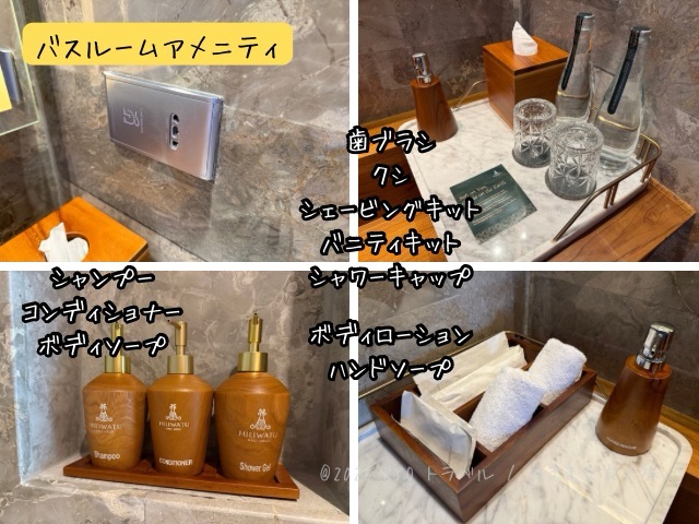 シャンプー、コンディショナー、ボディソープはホテルロゴの入ったボトルに詰め替えられているので、製造元は不明。使用感はシャンプーは泡立ちにくく、髪がパサつく印象。洗えればなんでもいいって方以外は、使い慣れたものを持参した方が良さそう。