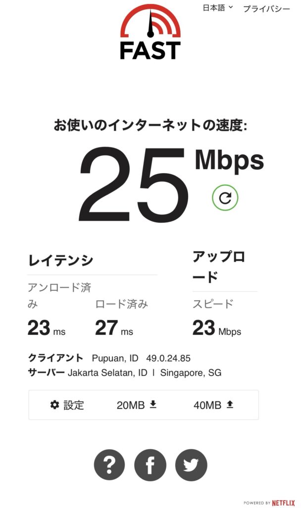 無料Wi-Fiはワンクリックで接続。パスワード無し。速度は25Mbpsと少し心許ない印象ですが、インターネットでの調べ物や動画視聴程度の利用でしたら問題ありませんでした。