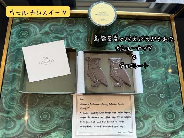 ソファー横のテーブルには、ウェルカムスイーツ(チョコレート、カシューナッツ)とメッセージカードが置かれていました。