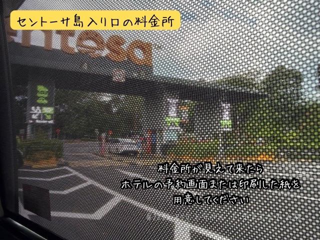 ホテルが位置するセントーサ島は入島料がかかるリゾート島なのですが、タクシーやGrabを利用した場合は島への橋を渡り切ったとこにある料金所にて、ホテルの予約画面を見せると無料で入島できます。料金所が近づいてくると運転手さんにホテルの予約はあるか聞かれるかと思いますので(目的地をホテルにしていても)、スマホの予約画面やプリントアウトしたものを料金所のスタッフさんに見せるようにしてください。