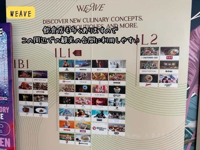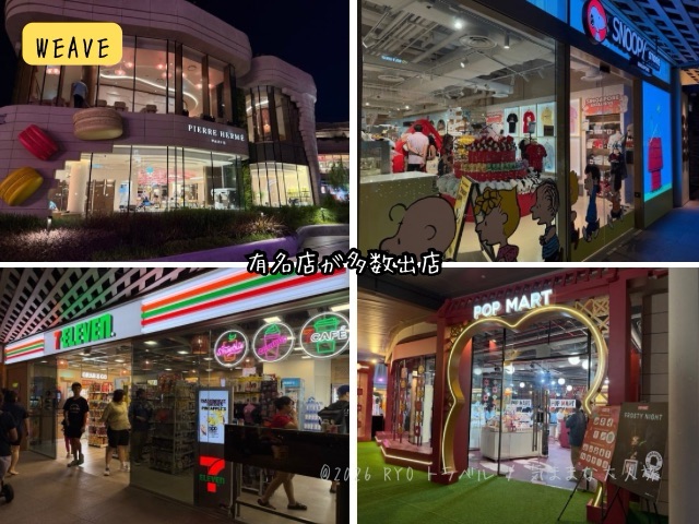WEAVEは2025年7月にオープンしたばかりの新しいショッピングモールで、有名飲食店(鼎泰豊、ジャンボ、ピエールエルメ、チャターボックス等)や雑貨店が入店しており、食事やお土産購入も楽しそうなラインナップでした。