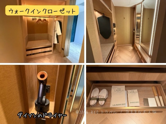 奥の方にダイソンのドライヤー、金庫、アイロン、アイロン台、雨傘がありました。