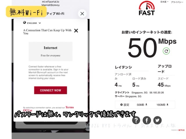 無料Wi-Fiは50Mbpsの速度が出ており、インターネットでの調べものや動画視聴には問題ない速度でした。パスワードは無く、接続すると表示される画面でボタンをクリックすると接続します。