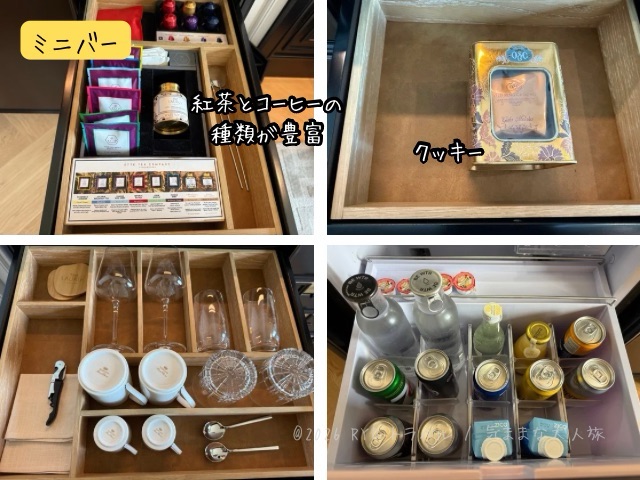 ミニバーの棚のところに浄水蛇口が付いており、紅茶などを飲む際にはここからケトルにいれて利用しました。引き出しの中に水筒もあるので、ここで水を汲んでテーブルに持って行くこともできます。