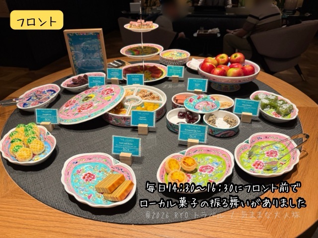チェックインカウンターの横では14:30~16:30にはローカルお菓子の振る舞いがあります。ニョニャクエ(ういろうみたいなお菓子)やパイナップルケーキ、エッグタルト、ラピス(バームクーヘンみたいなお菓子)等が振舞われるので、是非食べてみてください。