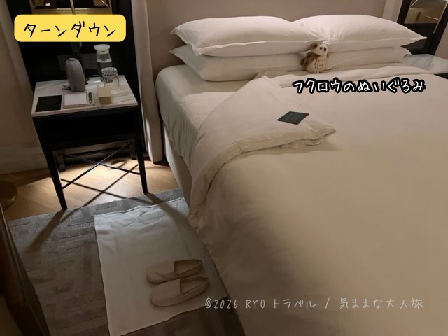ターンダウンサービスでは一般的な、タオル交換、ごみ捨て、ミニバー補充、カーテン閉め、ベットサイドに水とグラス、スリッパの配置に加えて、可愛いフクロウのぬいぐるみが枕元に置かれました。