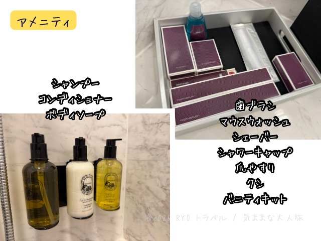 アメニティは歯ブラシ、マウスウォッシュ、シェーバー、シャワーキャップ、爪やすり、くし、バニティキット、ボディローション、石けん。
