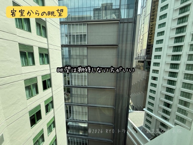 客室からの眺望は良くありません。内向きの部屋にアサインされたので、建物が間近に迫っており、特に見るものはありません。こればっかりは運なのでしょうがないですね。