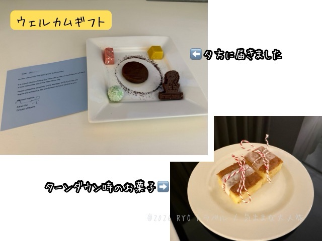 ○ ターンダウンサービス 18:30頃にターンダウンサービスのスタッフが来ました。タオル交換やカーテンの閉めなどの一般的な内容に加えて、テーブルの上にお菓子(カステラ)が置かれていました。
