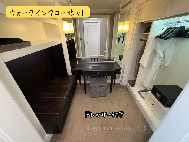 荷物置きの棚、ドレッサー、ハンガー、バスローブ、アイロン、アイロン台、金庫、スリッパ、洋服ブラシ、ソーイングセット、ランドリーバッグ、ドライヤーがありました。