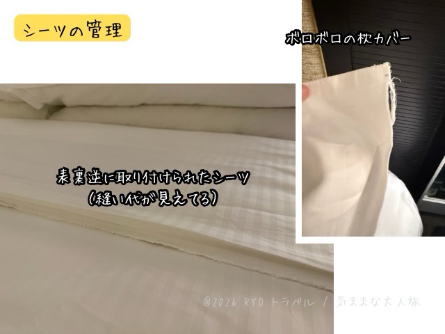 枕カバーも使い古されて端っこがほつれていたりと、使用する分には問題ありませんが気分は良くありませんでした。