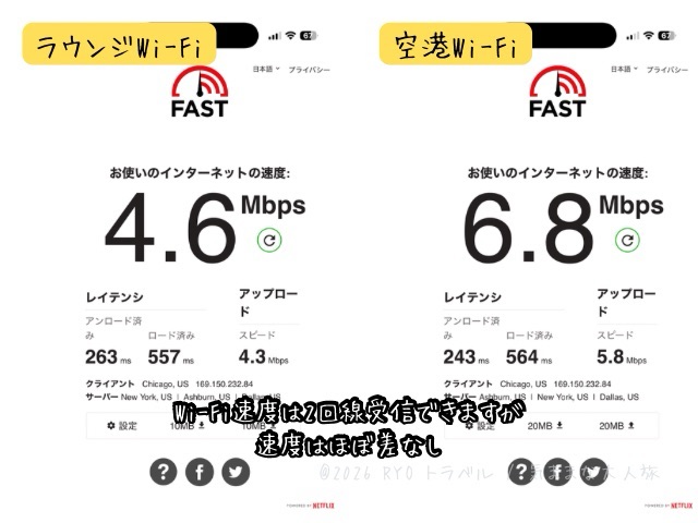 Wi-Fiはラウンジ専用のものが利用できます。速度は4.6Mbpsでした。正直遅いです。